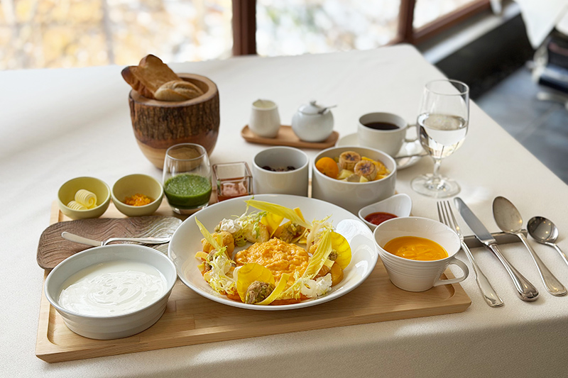 陰陽五行では「木」に属し、のびやかに巡る力が高まります。しかし同時に、その巡りを支える“中心の力”がなければ、身体は揺らぎやすくなります。そこで今回の朝食は「黄色」を主役に据えました。黄色は五行で「土」にあたり、消化吸収を司る象徴の色。春に高まりやすい気の動きを穏やかに受け止め、身体の基盤を整える役割を担います。やさしい甘み、爽やかな酸味、香りの立つ食材を組み合わせることで、巡りを促しながらも胃腸に負担をかけない設計にしました。土地の収穫がまだ始まらないこの時期だからこそ、私たちは“季節に必要な働き”を軸に献立を組み立てます。食材の名前ではなく、その性質をいただくという発想。春の黄色は、次の季節へ進むための静かな支えなのです。
