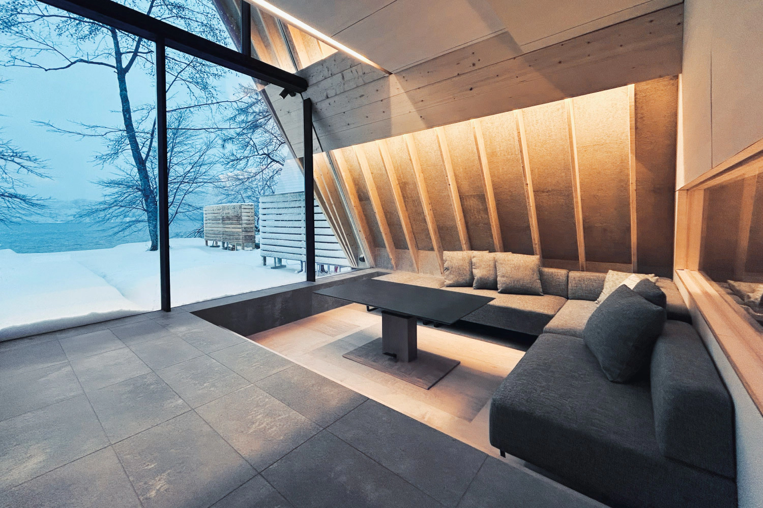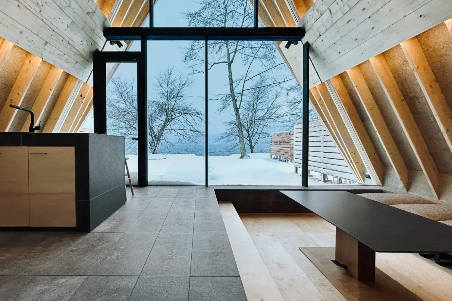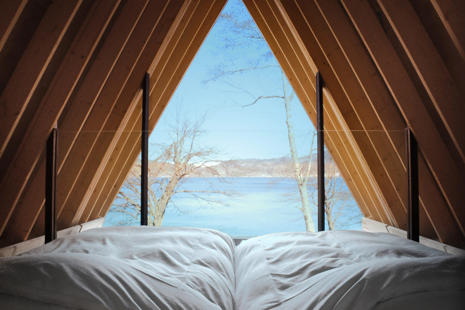 湖畔側にはAフレームならではの大きな窓を設け、