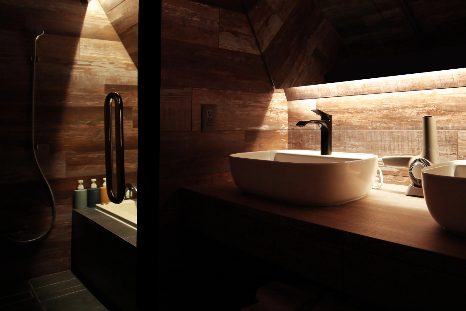 木の温もりに溢れるサニタリーは、深々としたバスタブを持つ
